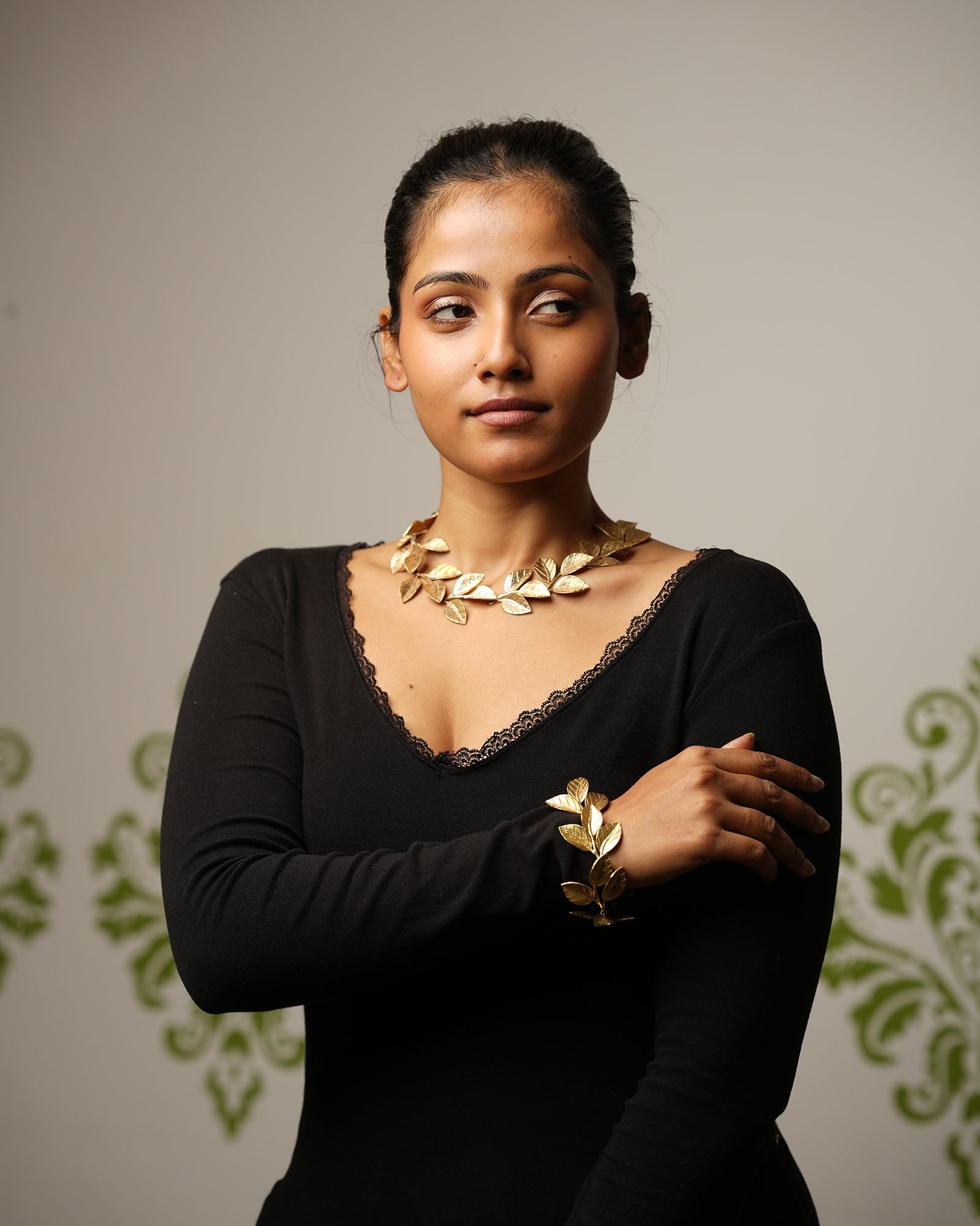 The Aparajita neckpiece showcases a graceful arrangement of gold leaves, each delicately textured to capture natural veins and contours. Its organic design wraps elegantly around the wrist, exuding earthy sophistication and timeless charm.