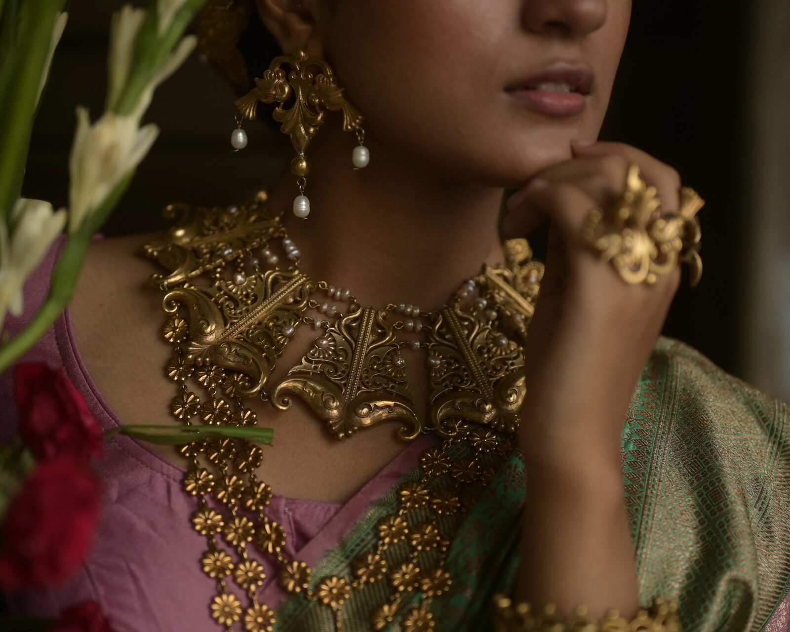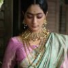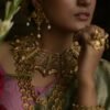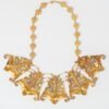 A fan-shaped gold panels adorned with intricate filigree and scrollwork, accented by tiny pearl clusters along the top edge. Its bold, architectural design exudes regal elegance, making it a striking statement piece for traditional attire.