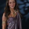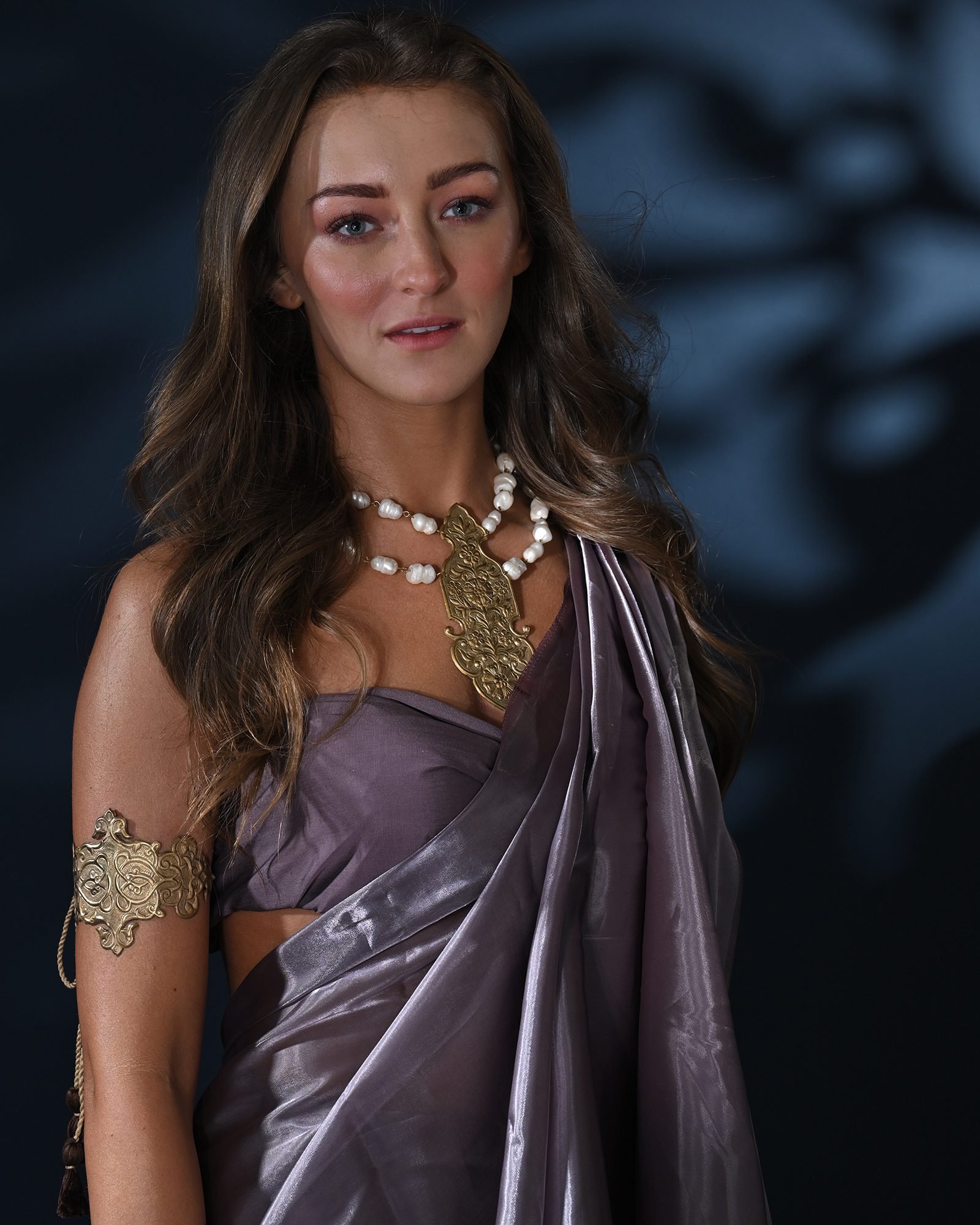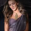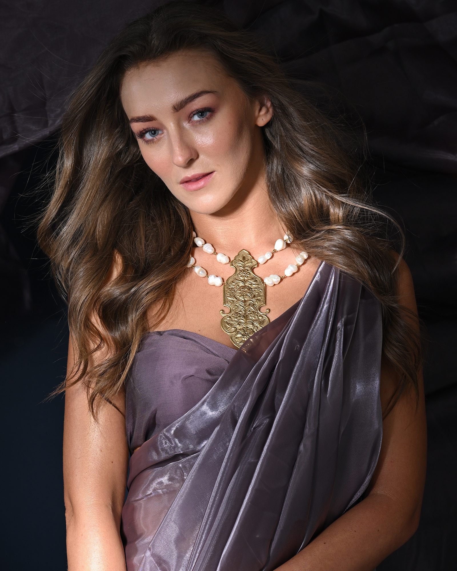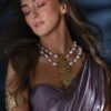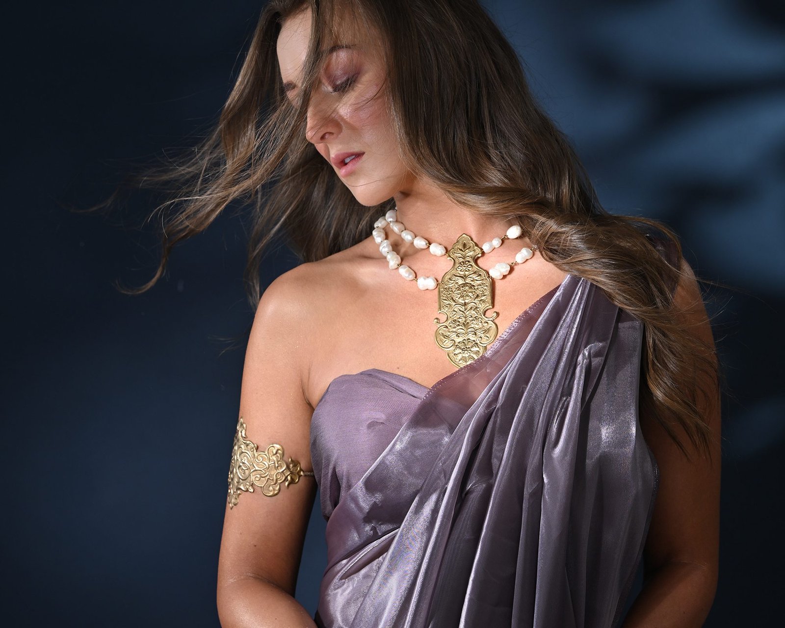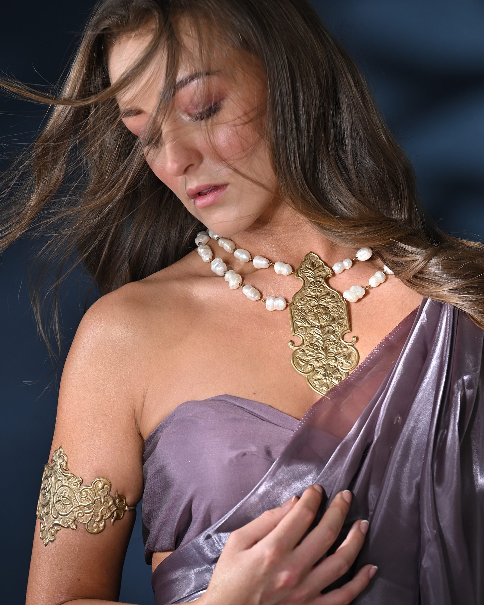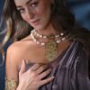 A peice with very intricate work on the golden motif, and beautifully held up with four chains with natural pearls