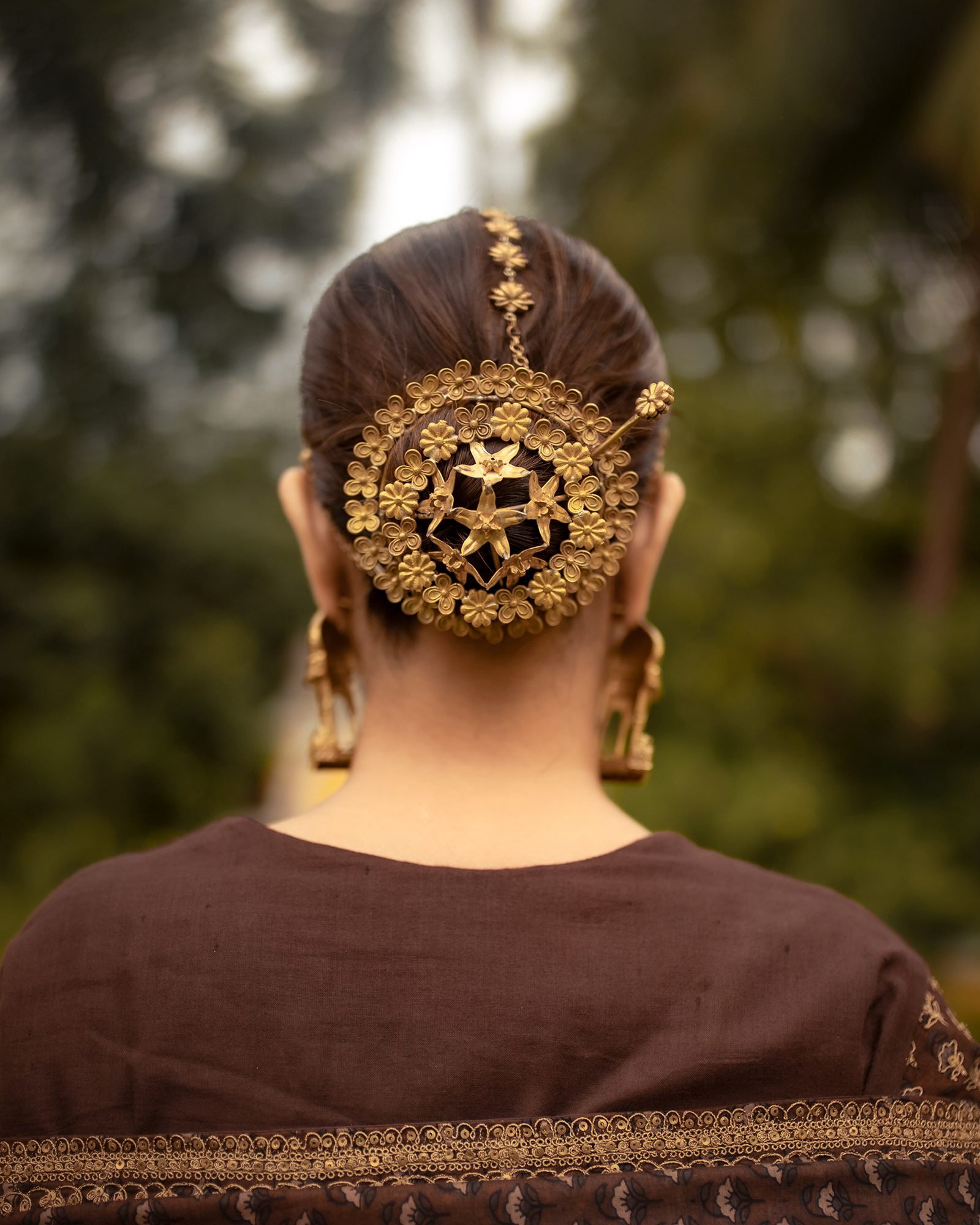 The buncage is a circular brass design, blooming with delicate clover-like florals encircling a star-shaped lattice at its heart, finished with a graceful trail of blossoms that flow upward into the hair.