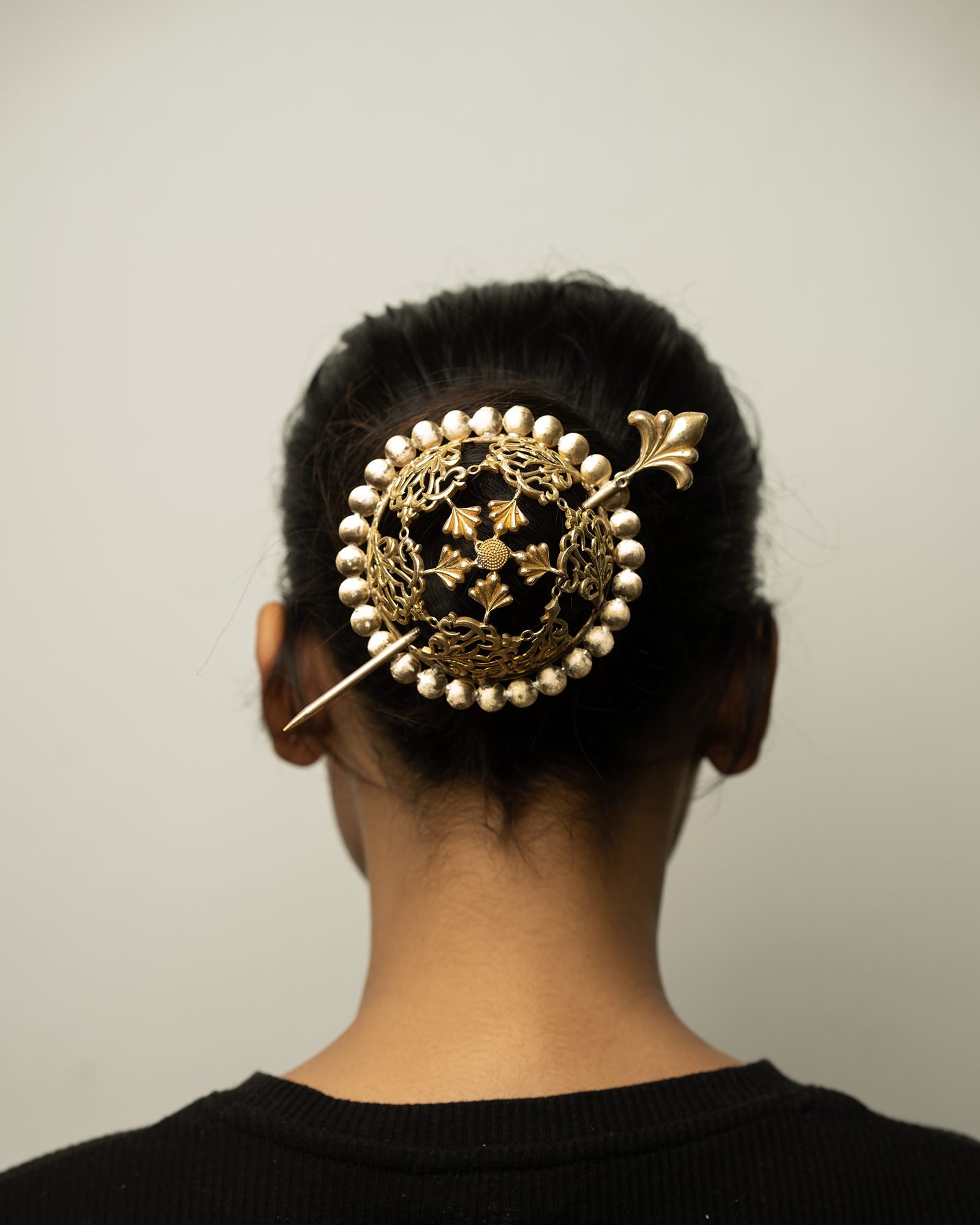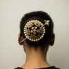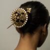 An ornate gold hair bun featuring an intricate circular filigree design, framed by a border of raised spherical accents. A slender decorative pin secures it into the bun, adding a touch of regal elegance and traditional charm to the hairstyle.