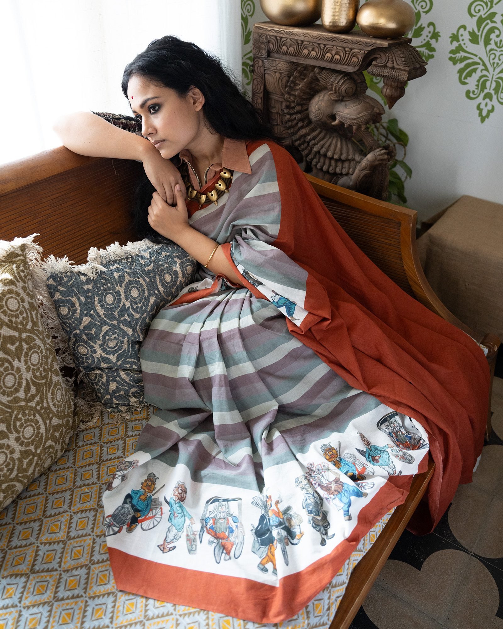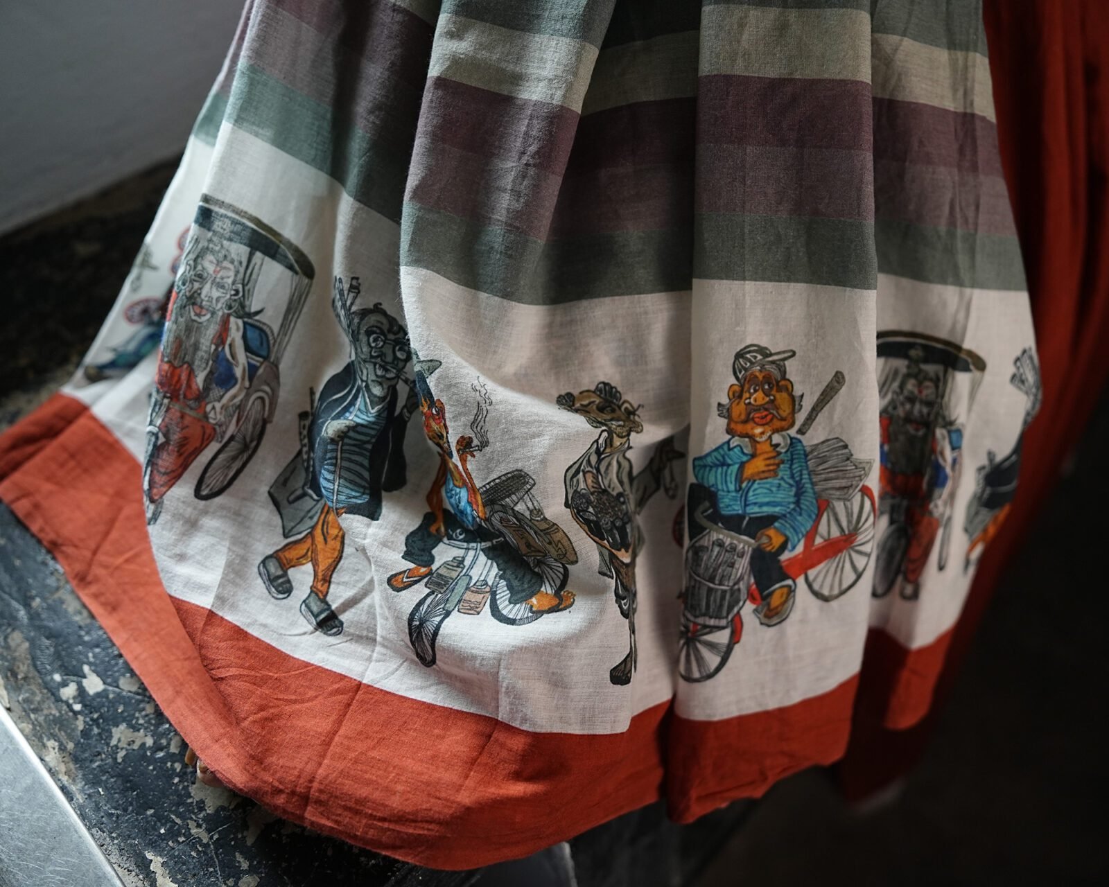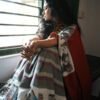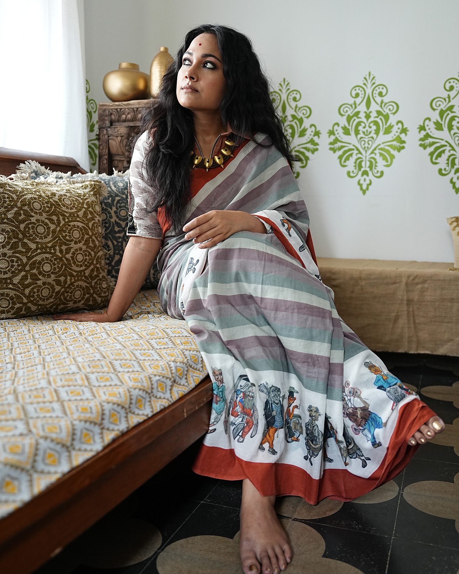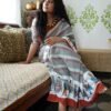 Customised hand painting digitally printed on 100 count hand spun cotton Saree.Very unique look with comfort of cotton.