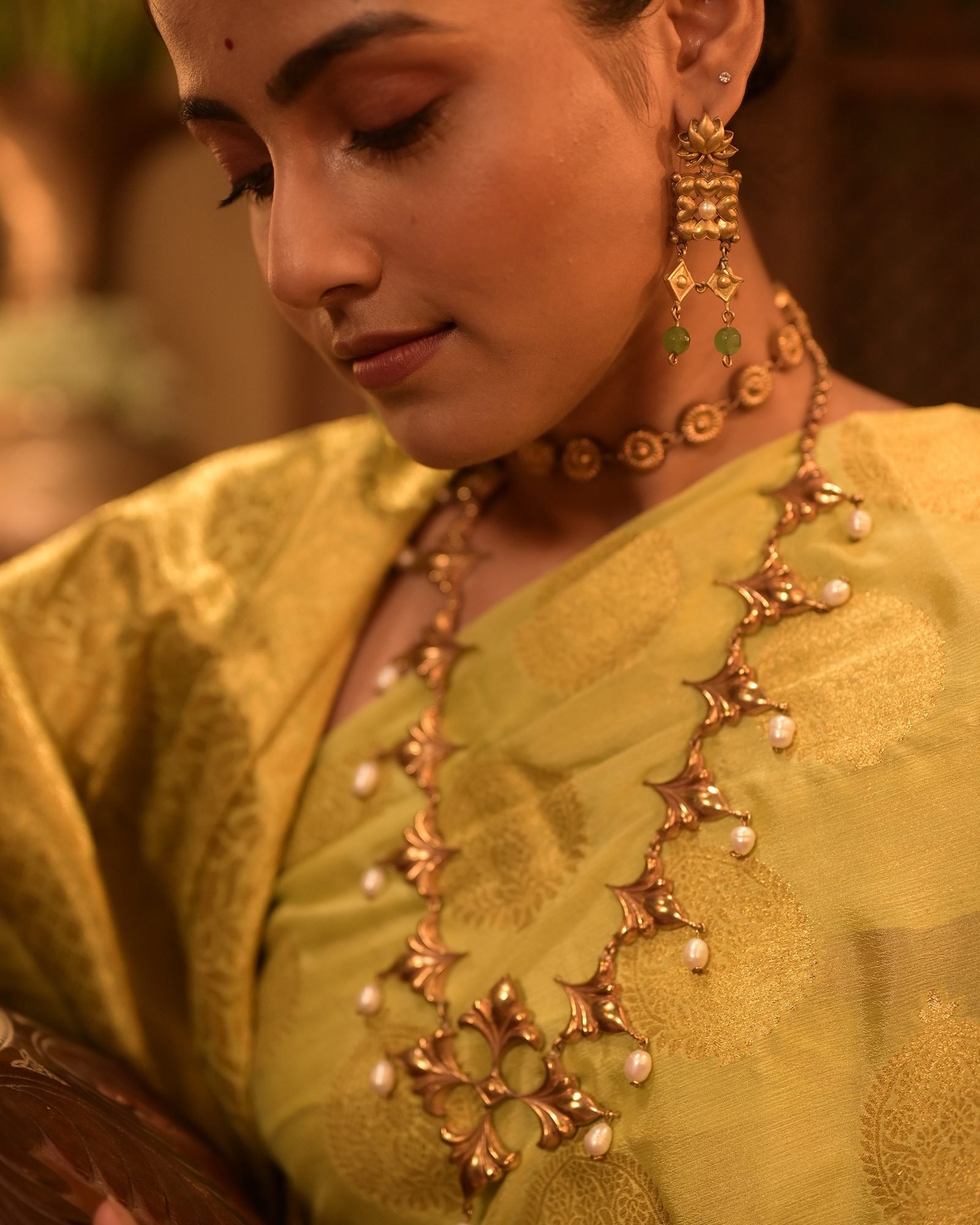 An elegant arrangement of gold-toned floral and leaf motifs, each adorned with delicate dangling pearls. Its symmetrical design and lustrous finish exude traditional charm, beautifully complementing ethnic attire.