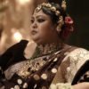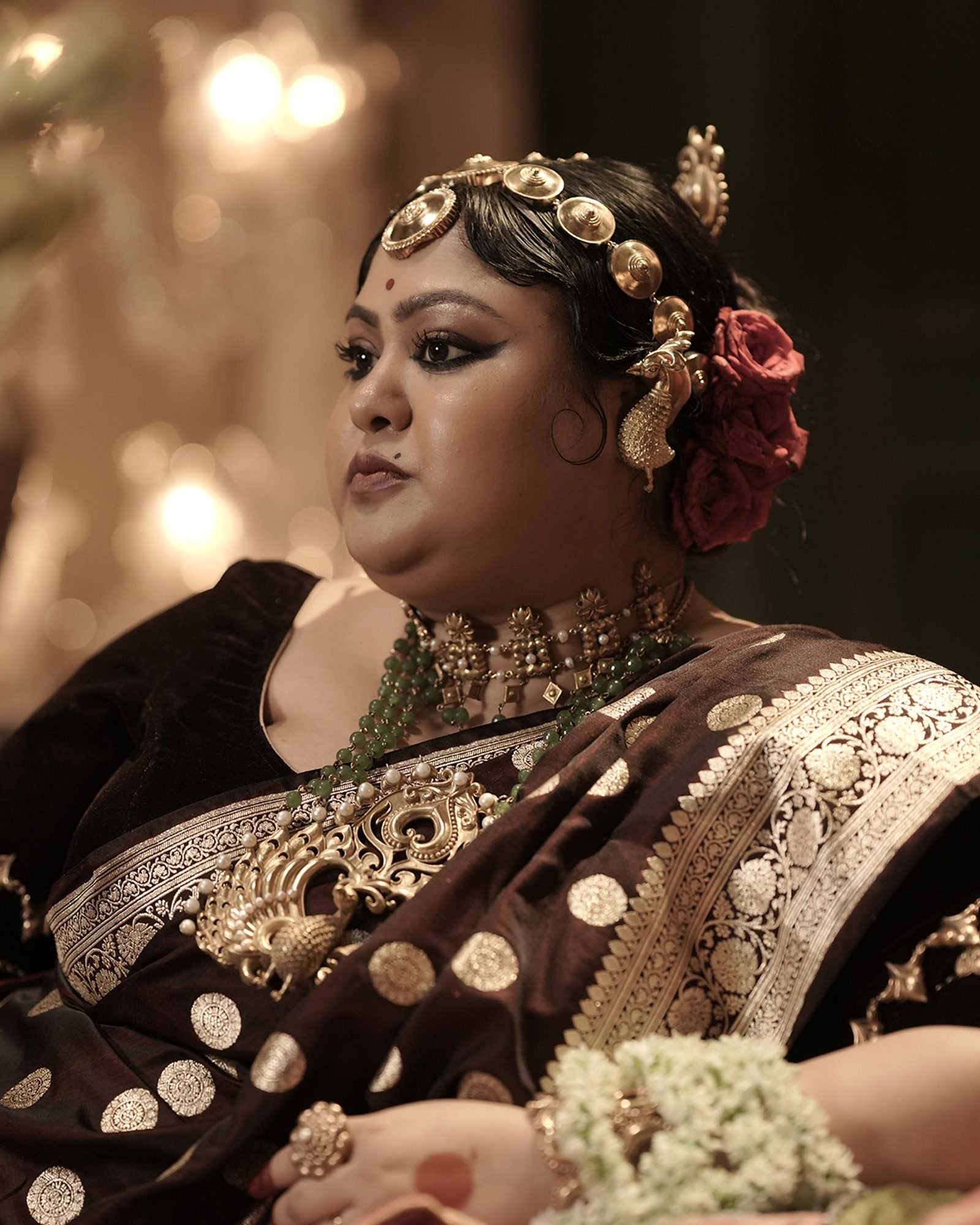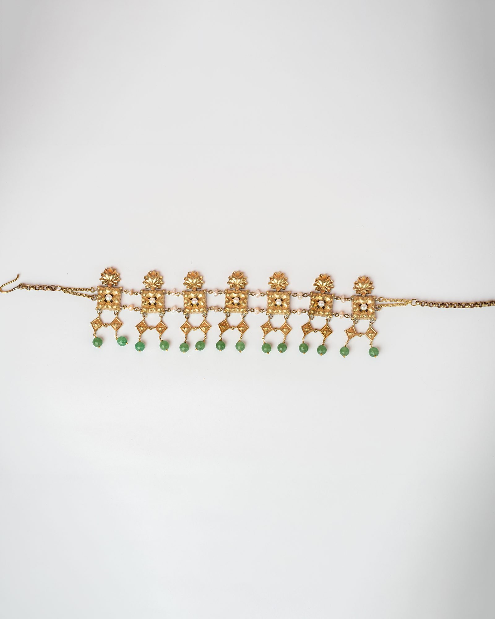 A lavish gold piece adorned with floral motifs and set with shimmering gemstones, radiating opulence. Strands of green beads cascade gracefully below it, adding a touch of regal color and elegance.