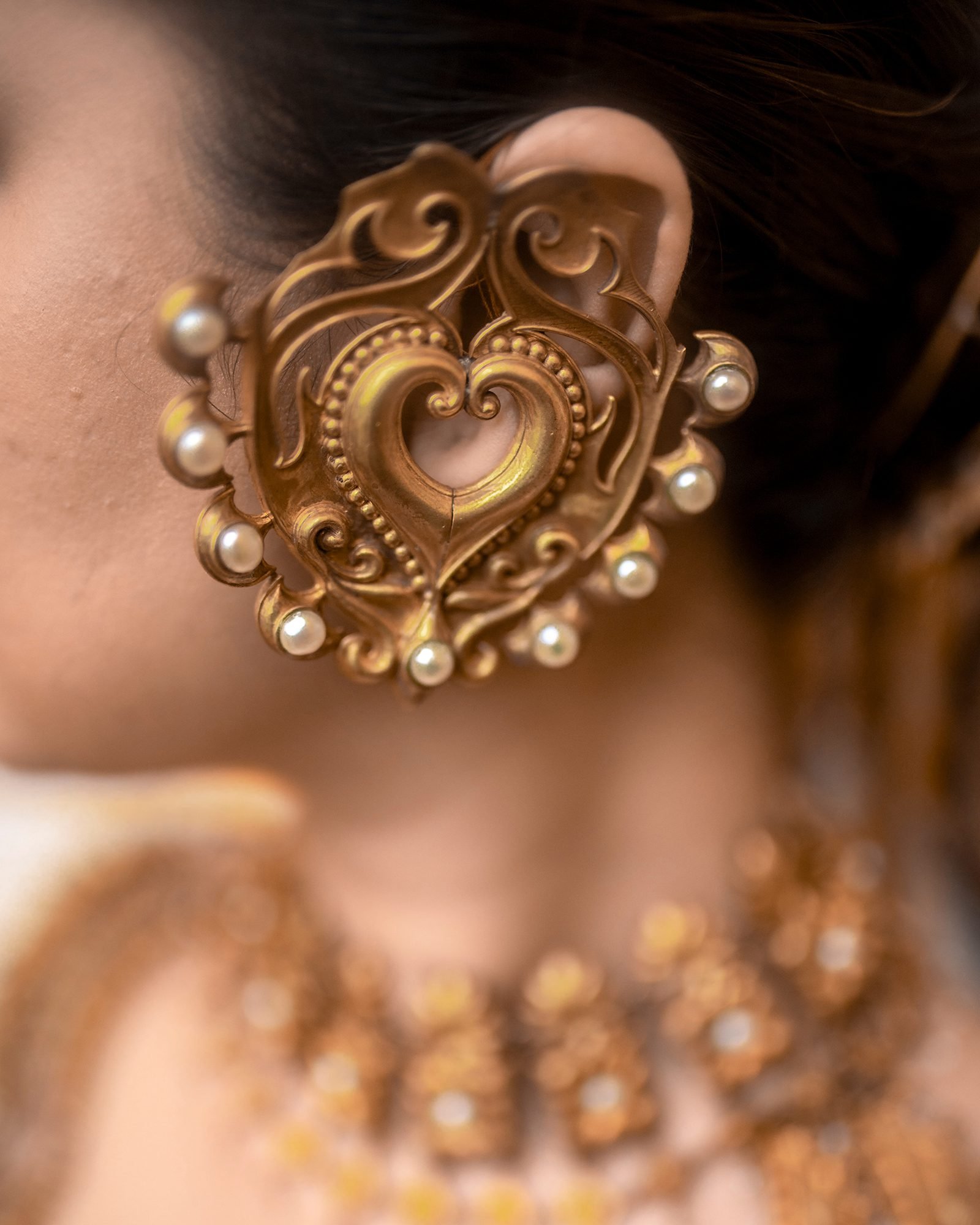The vibrant peacock feather, accented with lustrous pearls around the center, adding softness and charm.