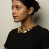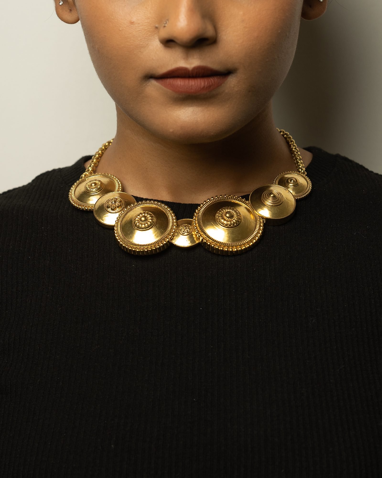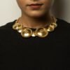 The choker is a striking gold necklace composed of multiple round, shield-like discs, each embellished with concentric circles and intricate central detailing.